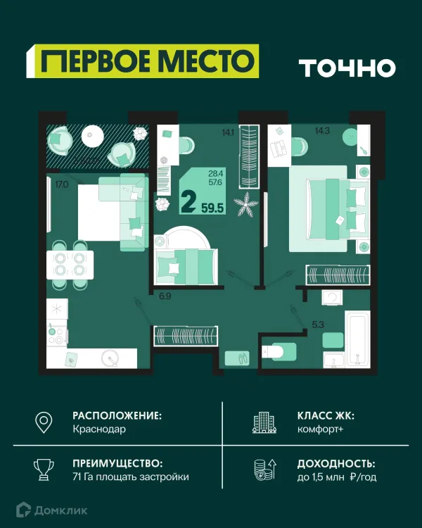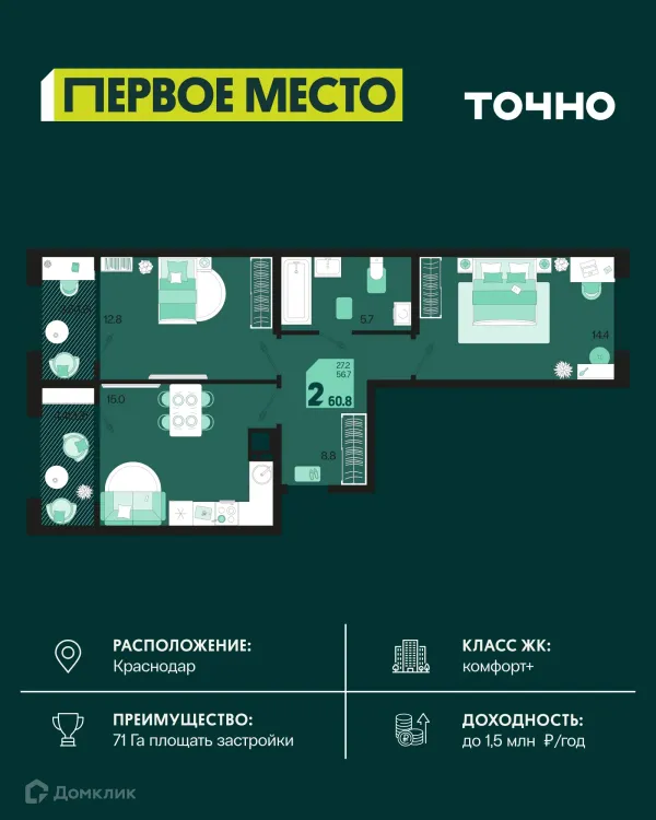 2 комн. квартира в Краснодаре в ипотеку от 71 474 руб/месяц