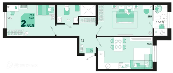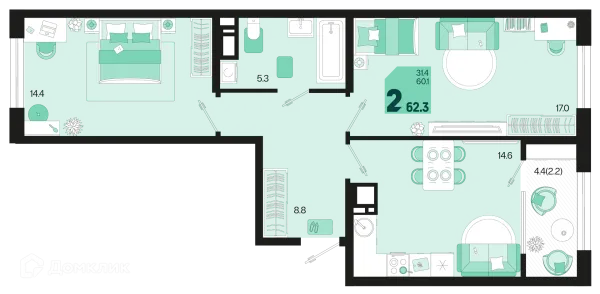 2 комн. квартира в Краснодаре в ипотеку от 61 123 руб/месяц
