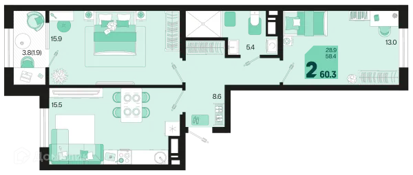 2 комн. квартира в Краснодаре в ипотеку от 60 287 руб/месяц