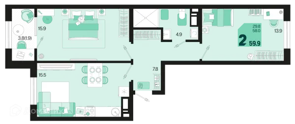 2 комн. квартира в Краснодаре в ипотеку от 69 937 руб/месяц