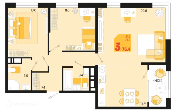 3 комн. квартира в Краснодаре в ипотеку от 96 277 руб/месяц